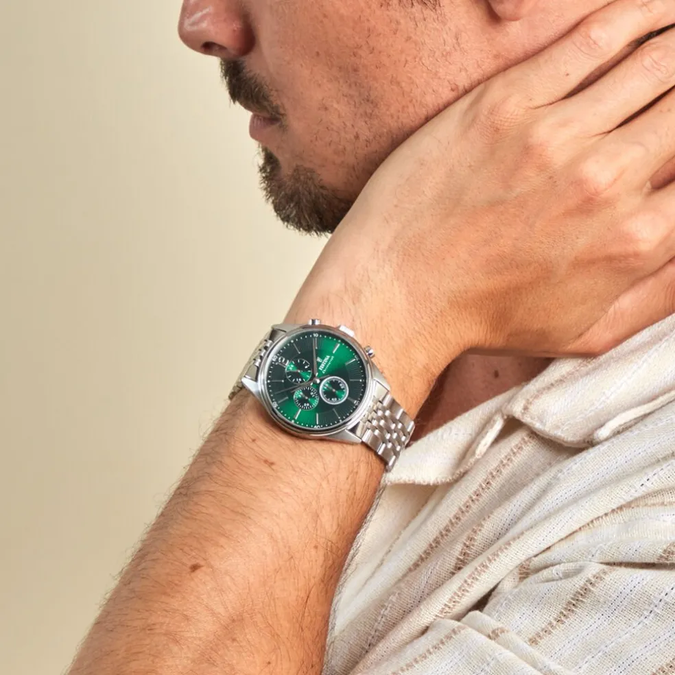 Montre Festina Timeless Chronograph Acier Argenté Ronde Quartz Chronographe 41.5mm Fond Vert Bracelet Acier Argenté F20285/8