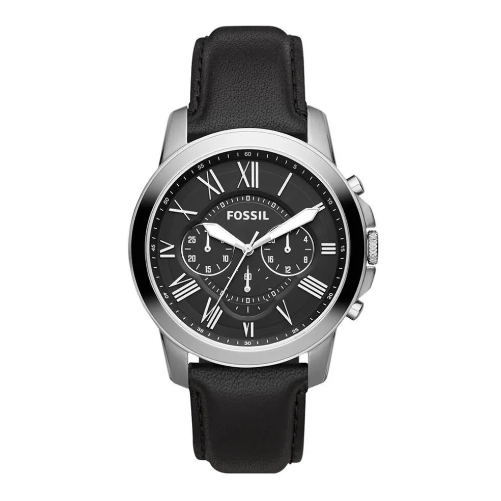 Montre Fossil Grant Acier Blanc Ronde Quartz Chronographe 44mm Fond Noir Bracelet Cuir Noir Fs4812