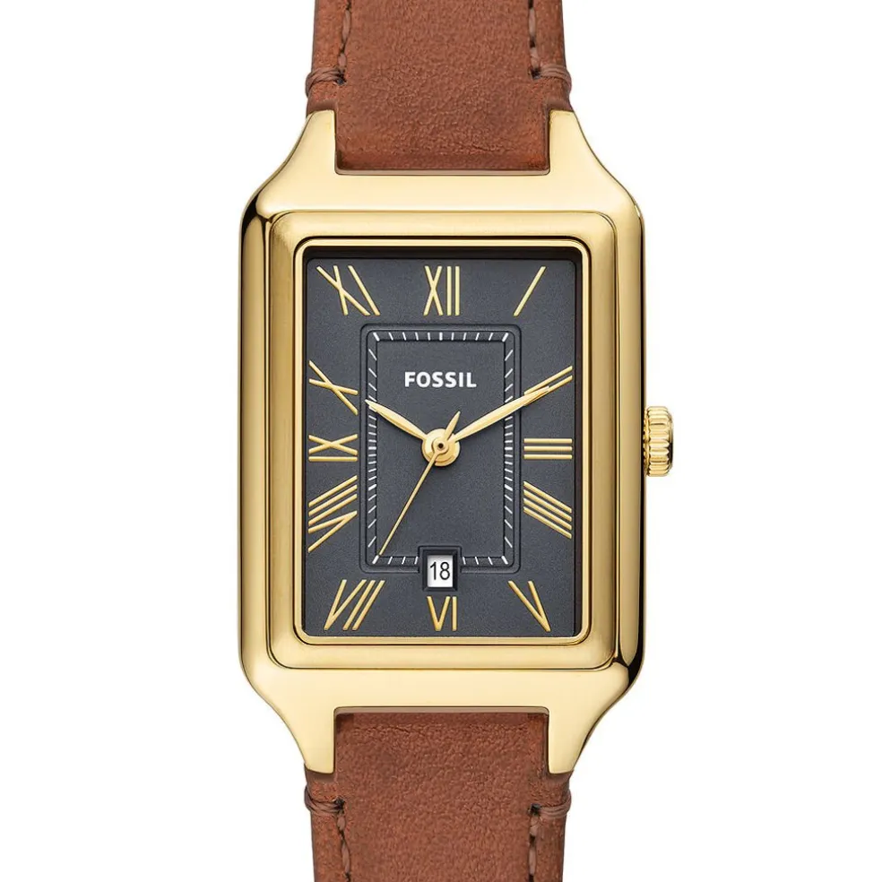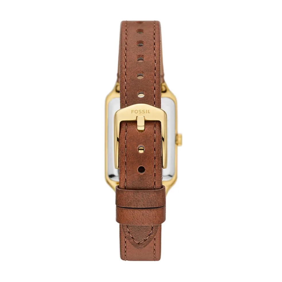 Montre Fossil Raquel Acier Dore Rectangulaire Quartz 23mm Fond Gris Bracelet Cuir Marron Es5303