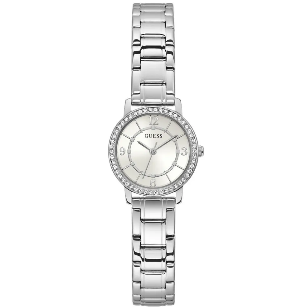 Montre Guess Melody Acier Ronde Quartz 28mm Fond Blanc Lunette Strass Bracelet Acier Gw0468l1