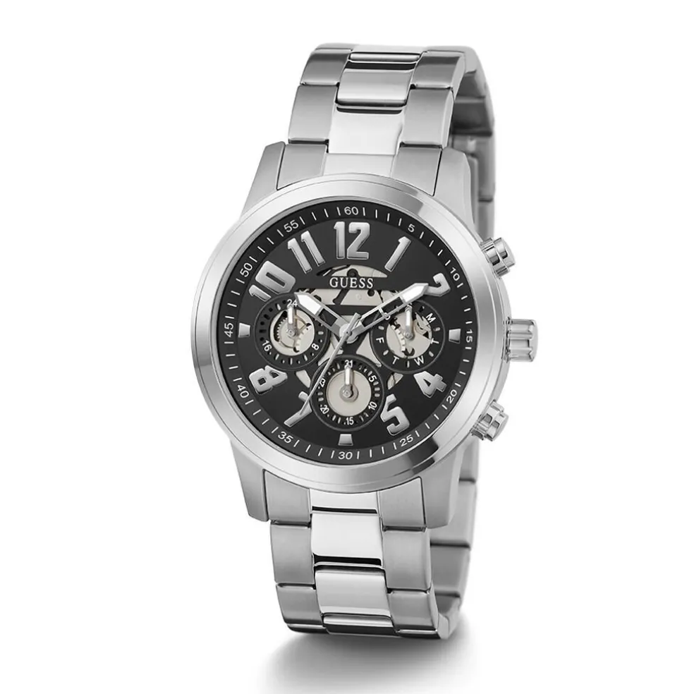 Montre Guess Parker Acier Argenté Rond Quartz Multifonction 44mm Fond Noir Bracelet Acier Argenté Gw0627g1