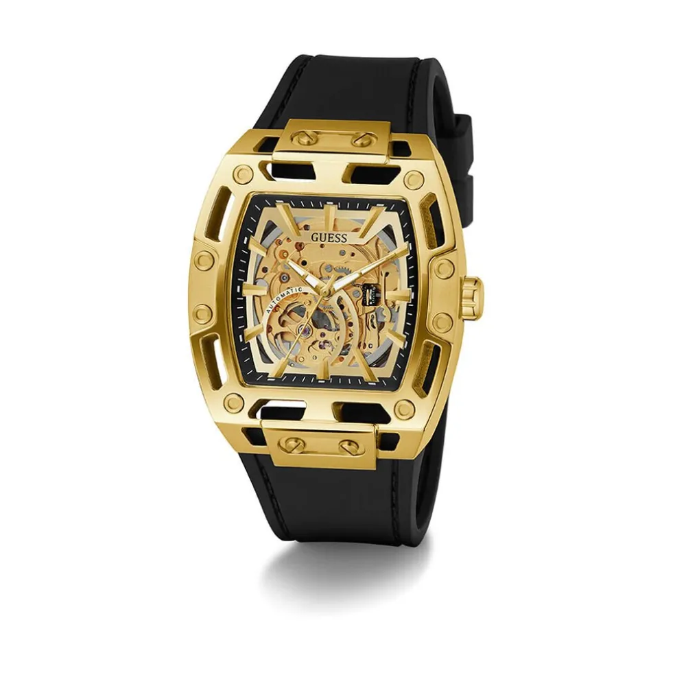 Montre Guess Phoenix Acier Inoxydable Doré Automatique Tonneau 42Mm Fond Champagne Coeur Ouvert Bracelet Silicone Noir Gw0980G2