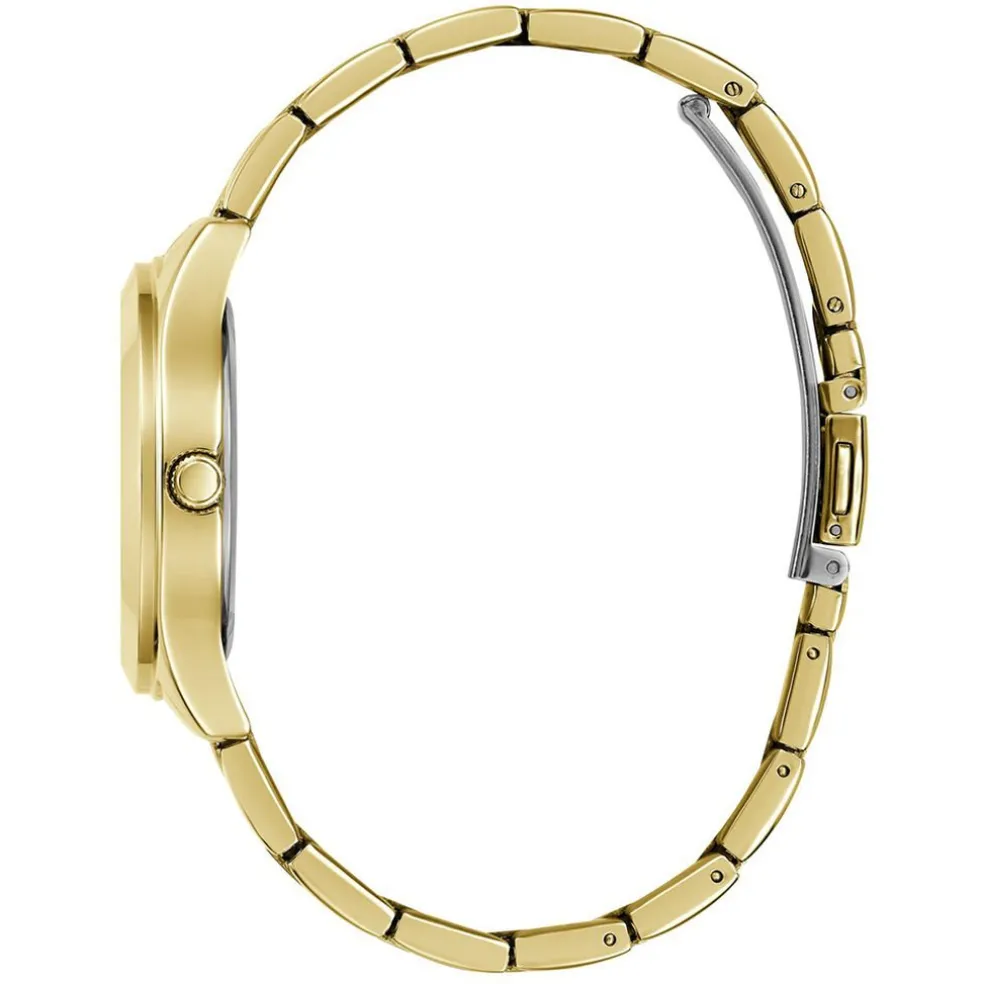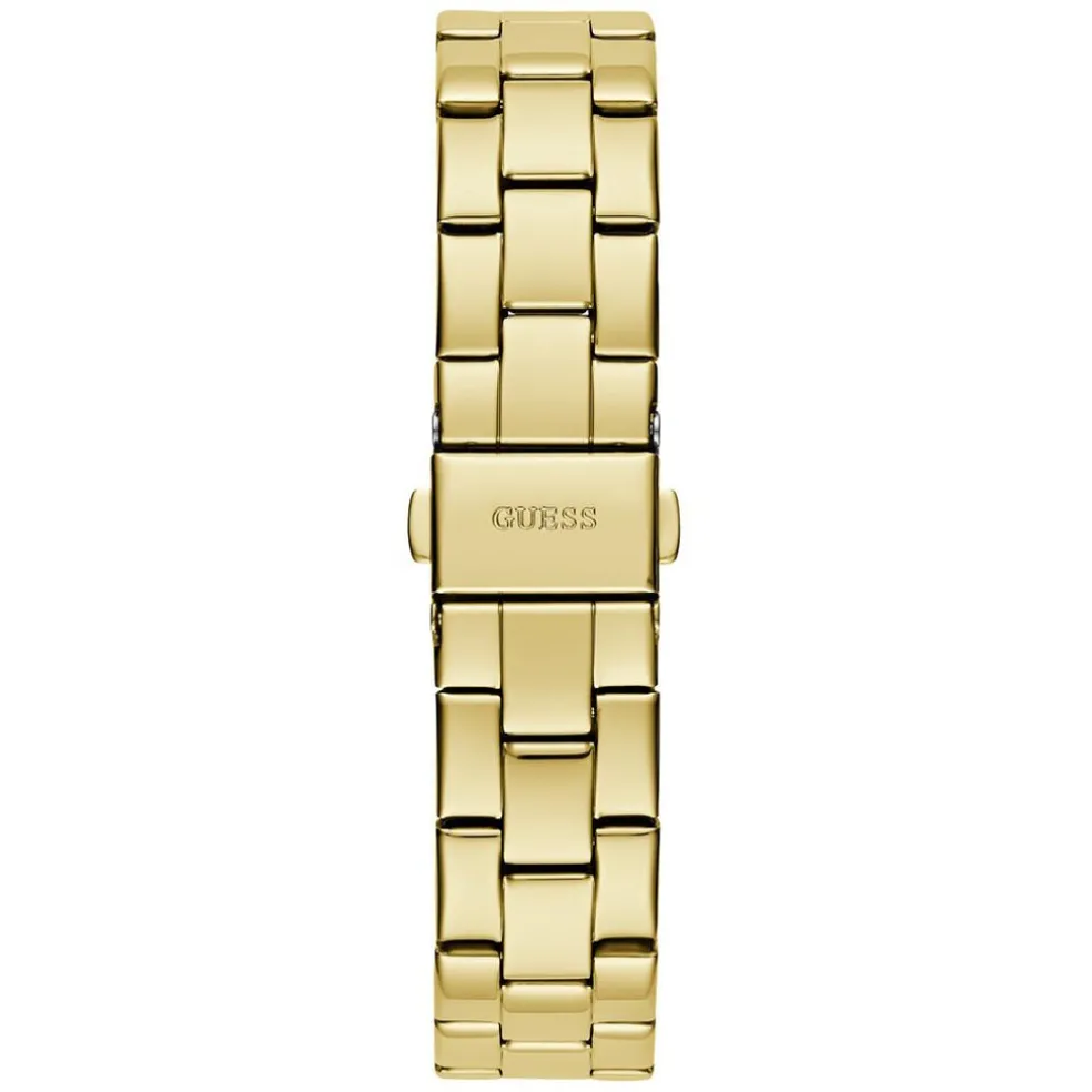 Montre Guess Tri Plaque Acier Doré Ronde Quartz 34mm Fond Champagne Motif Triangle Noir Logo Bracelet Acier Doré Gw0675l2