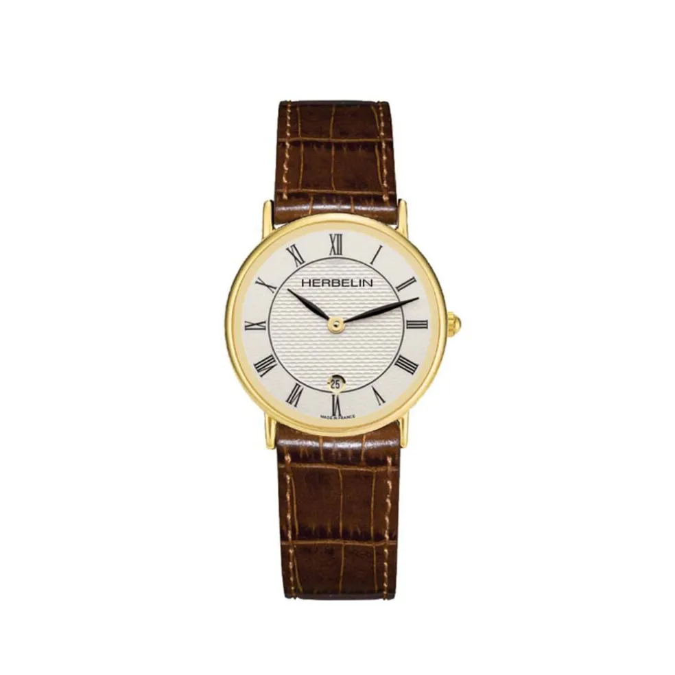 Montre Herbelin Classique Acier Dore Ronde 26mm Fond Blanc Bracelet Cuir Marron 16845p08ma