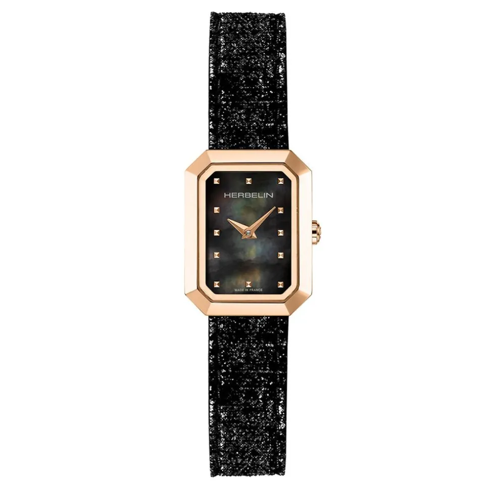 Montre Herbelin Octogône Acier Dore Rectangulaire 26.4×20.4mm Fond Nacre Noire Bracelet Cuir D’agneau Noir Paillete 17446pr49