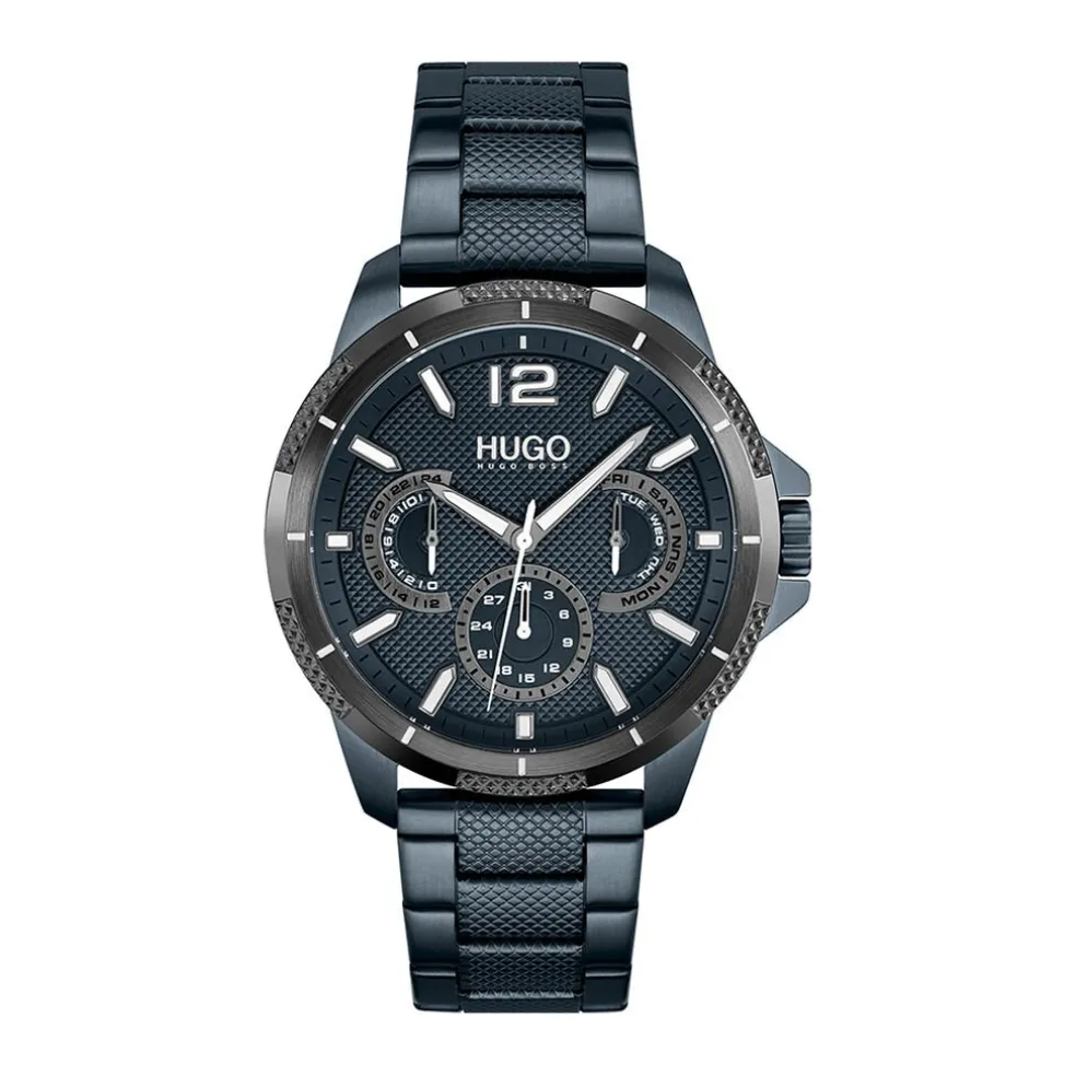 Montre Hugo Sport Acier Bleu Ronde Quartz Multifonction 46mm Fond Bleu Lunette Grise Bracelet Acier Bleu 1530194