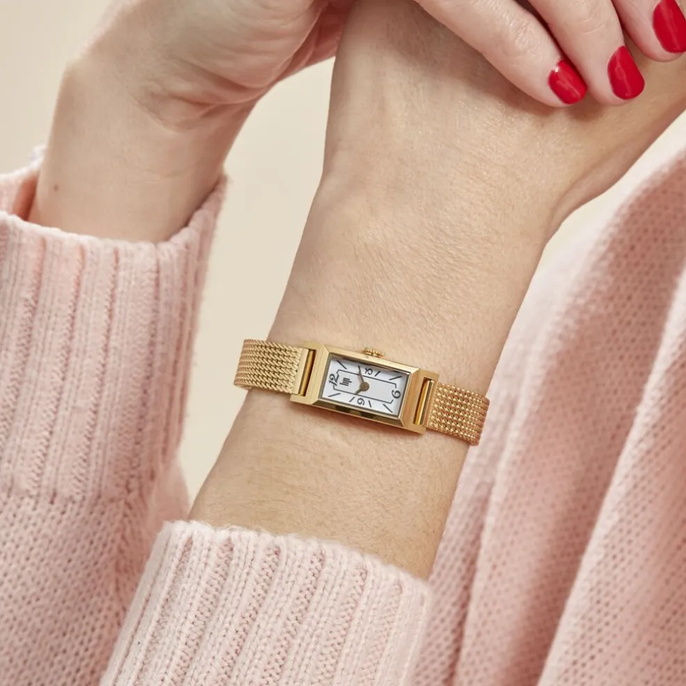 Montre Lip Churchill T13 Acier Dore Rectangulaire Quartz 13×29 Mm Fond Blanc Bracelet Acier Dore Maille Milanaise 671226