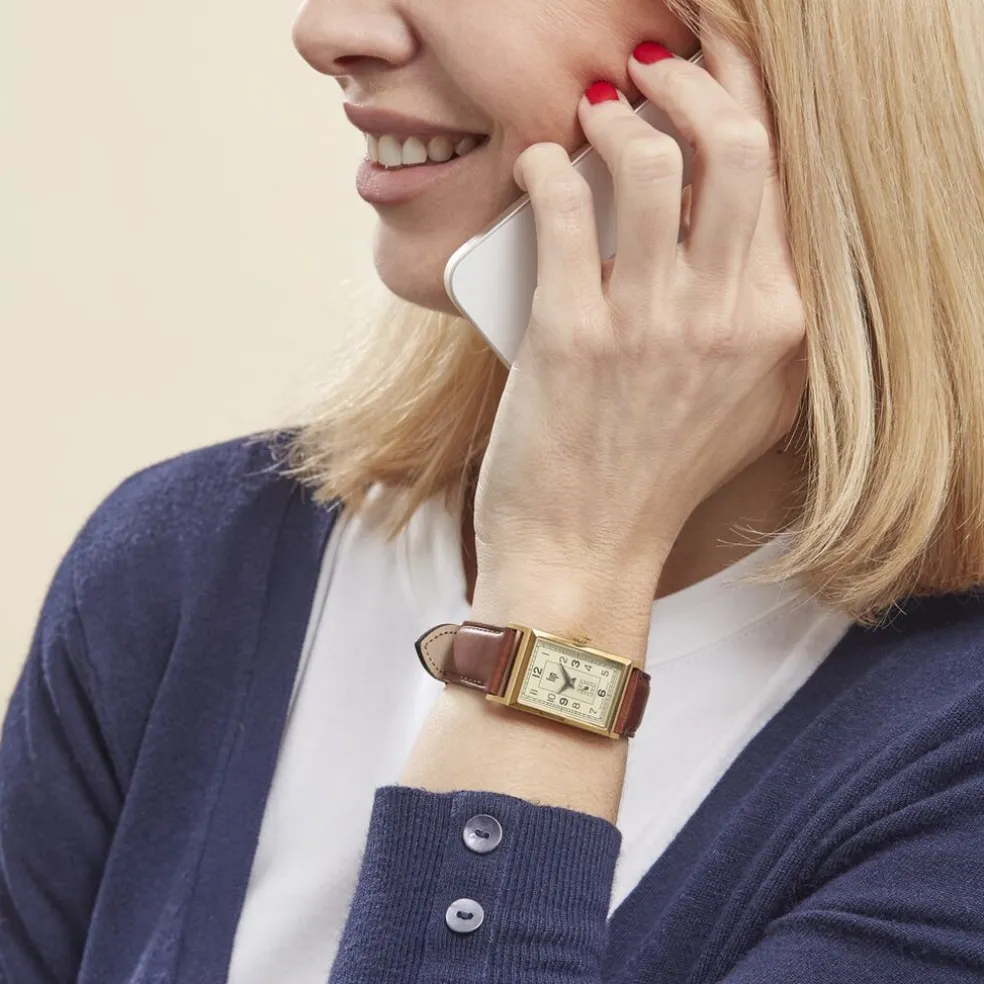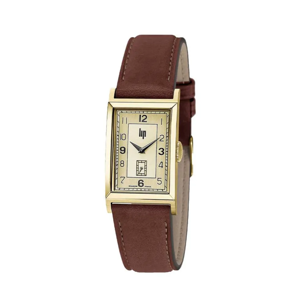 Montre Lip Churchill T18 Acier Dore Rectangulaire Quartz 21.2×38.50mm Fond Doré Bracelet Cuir Marron 671014