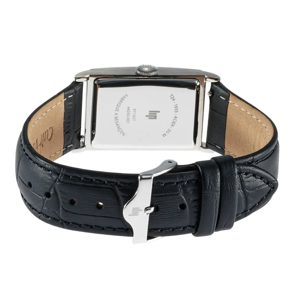 Montre Lip Churchill T24 Acier Argente Rectangulaire Quartz 23.5mmx41.5mm Fond Argente Bracelet Cuir De Vache Noir 671927