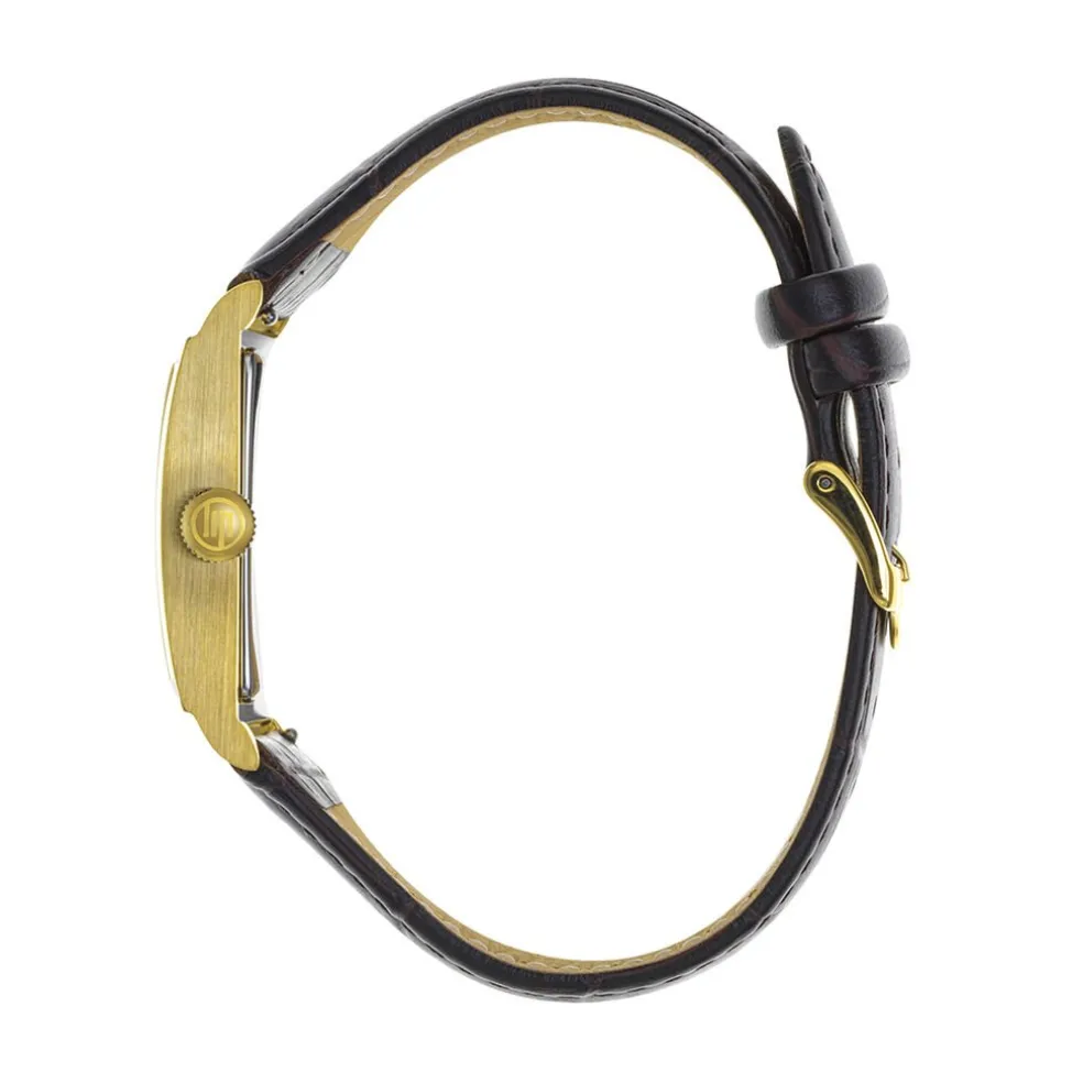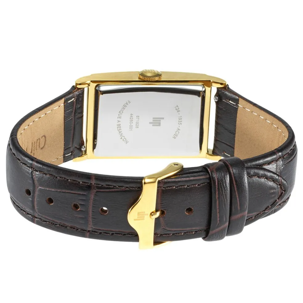 Montre Lip Churchill T24 Acier Dore Rectangulaire Quartz 23.5mmx41.5mm Fond Argente Bracelet Cuir De Vache Marron 671928
