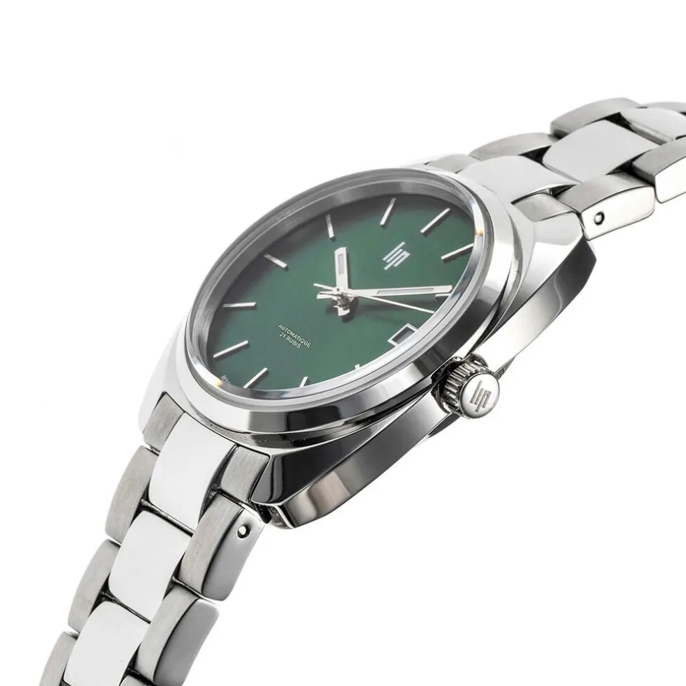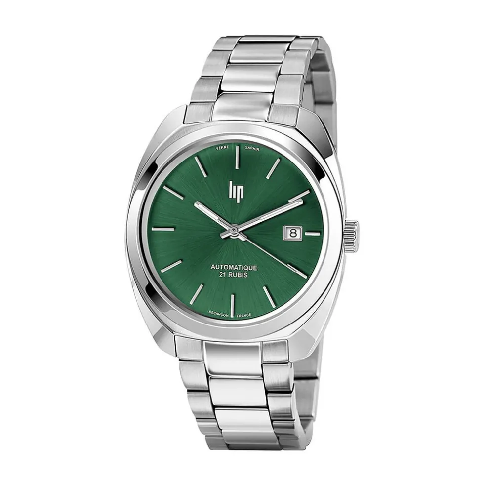 Montre Lip Général De Gaulle Acier Inoxydable Argenté Automatique Ronde 39Mm Fond Vert Bracelet Acier Inoxydable Argenté 671369