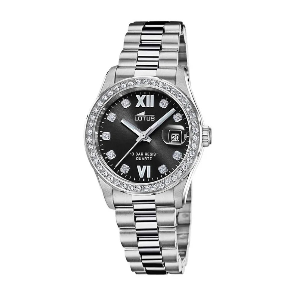 Montre Lotus Freedom Collection Acier Argente Ronde Quartz 32.5mm Lunette Strass Fond Noir Bracelet Acier Argente 18933/4
