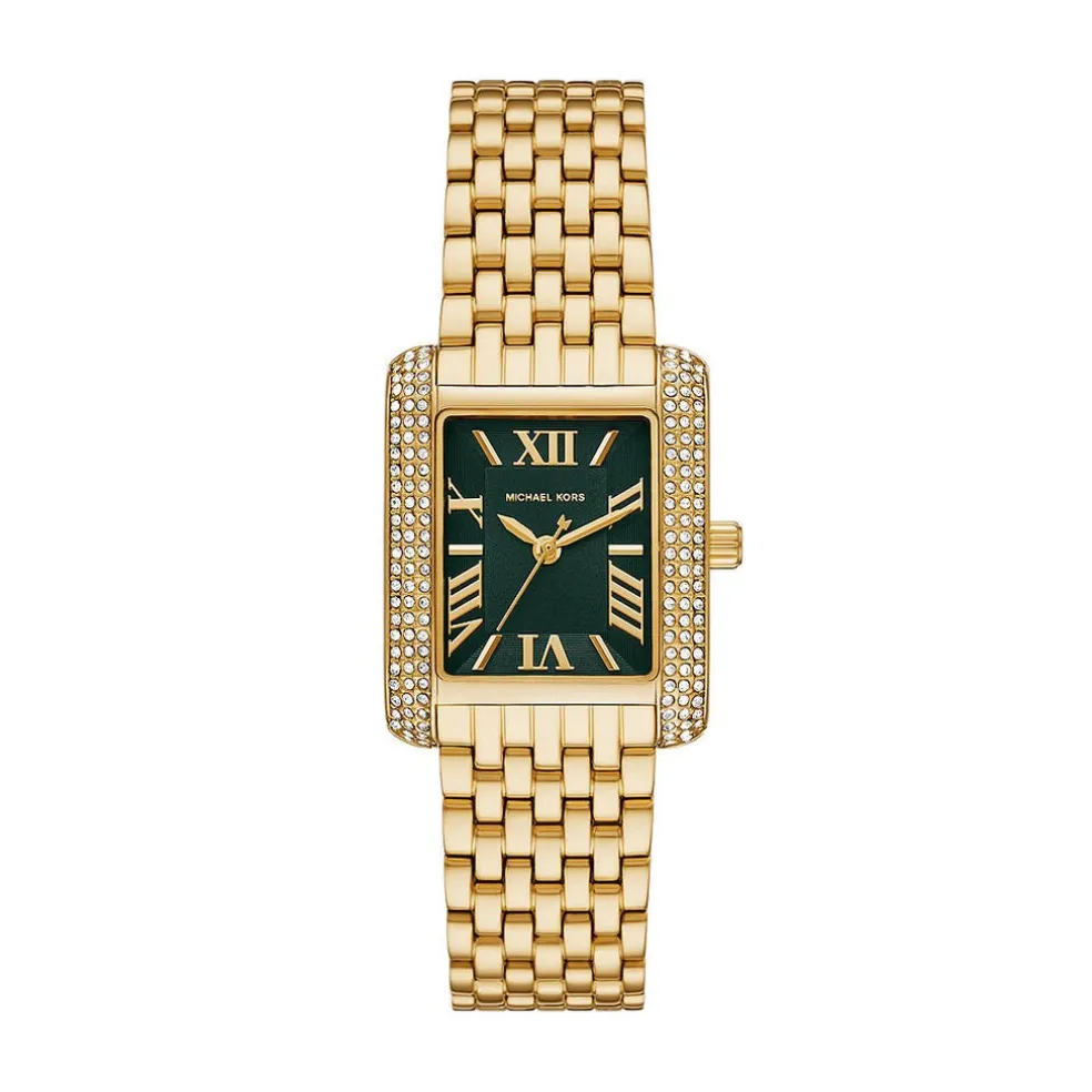 Montre Michael Kors Emery Acier Doré Rectangulaire Quartz 27mm Fond Vert Lunette Strassée Bracelet Acier Doré Mk4742