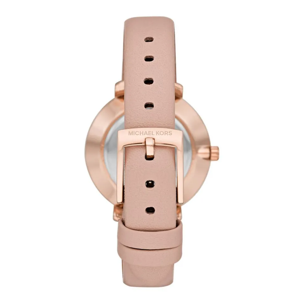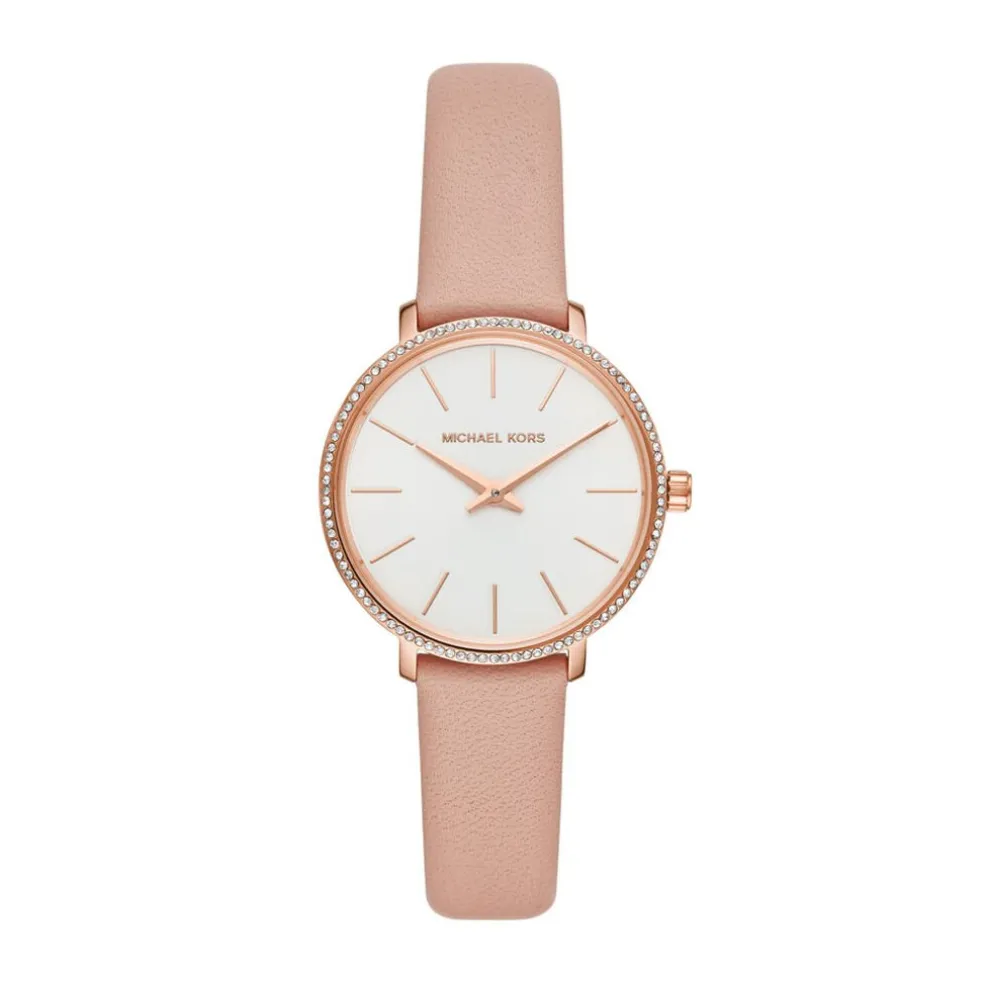 Montre Michael Kors Pyper Acier Dore Ronde Quartz 32mm Fond Blanc Bracelet Cuir Rose Mk2803