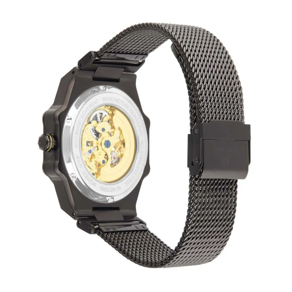 Montre Montignac Octogon Automatique Acier Noir Geometrique Automatique 44mm Fond Noir C艙ur Ouvert Bracelet Acier Noir Milanais Mow808