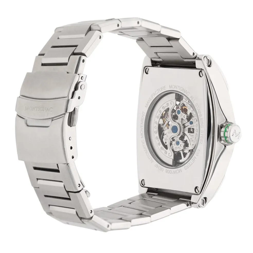 Montre Montignac Tonneau Automatique Acier Argente Tonneau Automatique 53.7mmx45mm Fond Vert Bracelet Acier Argente Mow1008