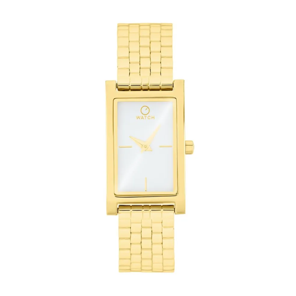 Montre O Watch Oblong Alliage Dore Rectangulaire Quartz 19mm Fond Blanc Bracelet Maillons Acier Dore P101008-h