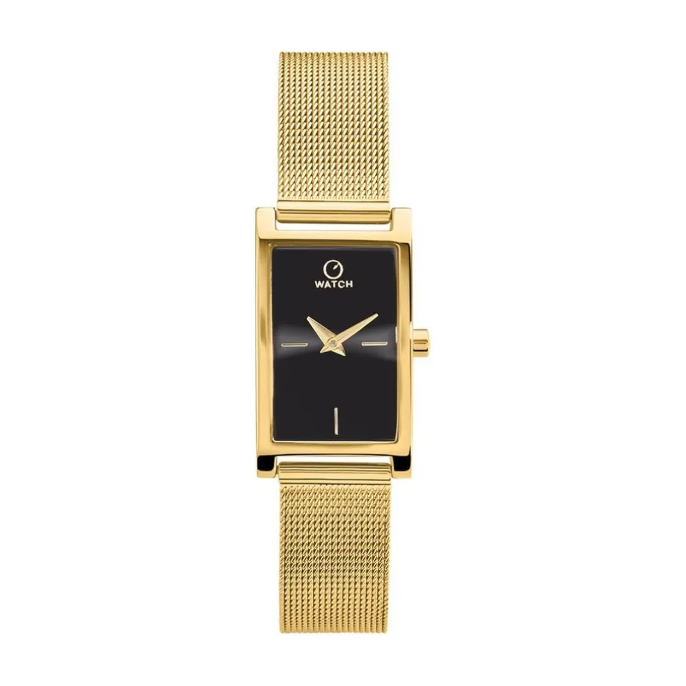 Montre O Watch Oblong Alliage Doré Rectangulaire Quartz 19mm Fond Noir Bracelet Maille Milanaise Acier Doré P101008-g