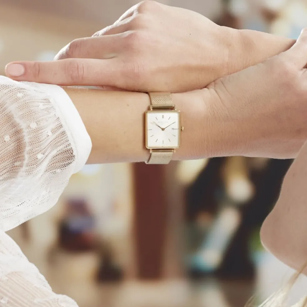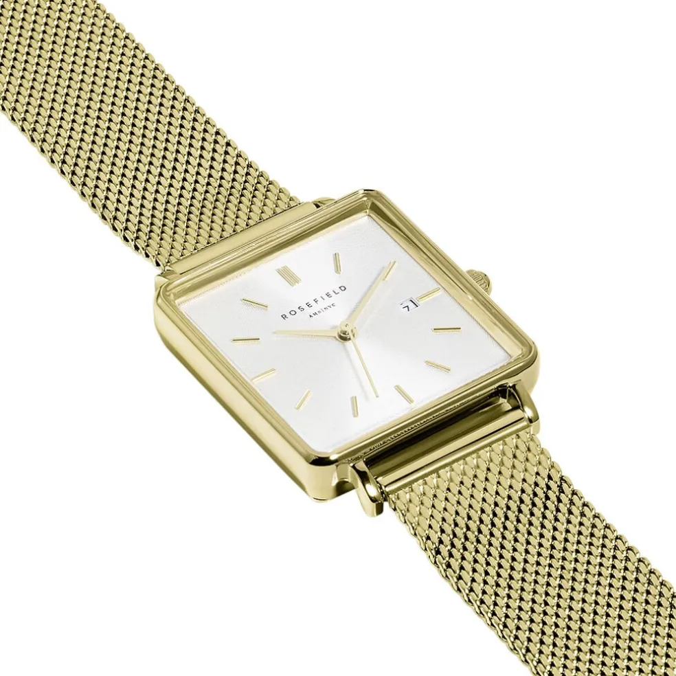 Montre Rosefield Boxy Acier Doré Carré Quartz 26x28mm Fond Blanc Bracelet Milanais Acier Doré Qwsg-q03