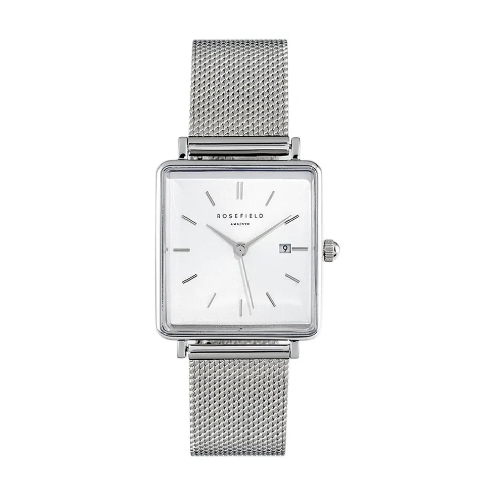 Montre Rosefield Boxy Acier Argenté Carré Quartz 26x28mm Fond Blanc Bracelet Milanais Acier Argenté Qwss-q02
