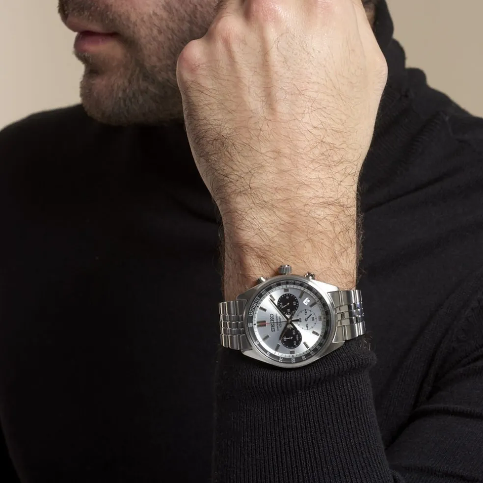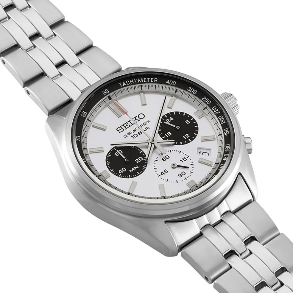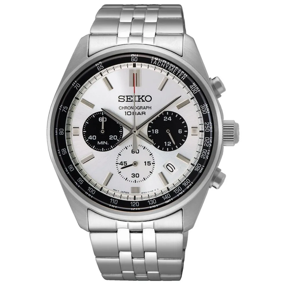 Montre Seiko Sport Acier Bicolore Ronde Quartz Chronographe 41.5mm Fond Blanc Et Noir Bracelet Acier Argenté 10atm Ssb425p1