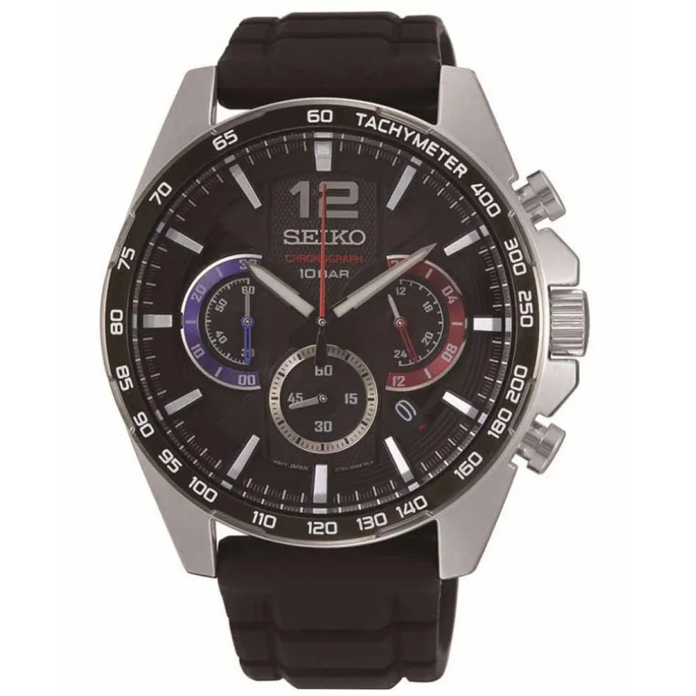 Montre Seiko Sport Acier Blanc Ronde Quartz Chronographe 43.9mm Fond Noir Bracelet Silicone Noir Ssb347p1