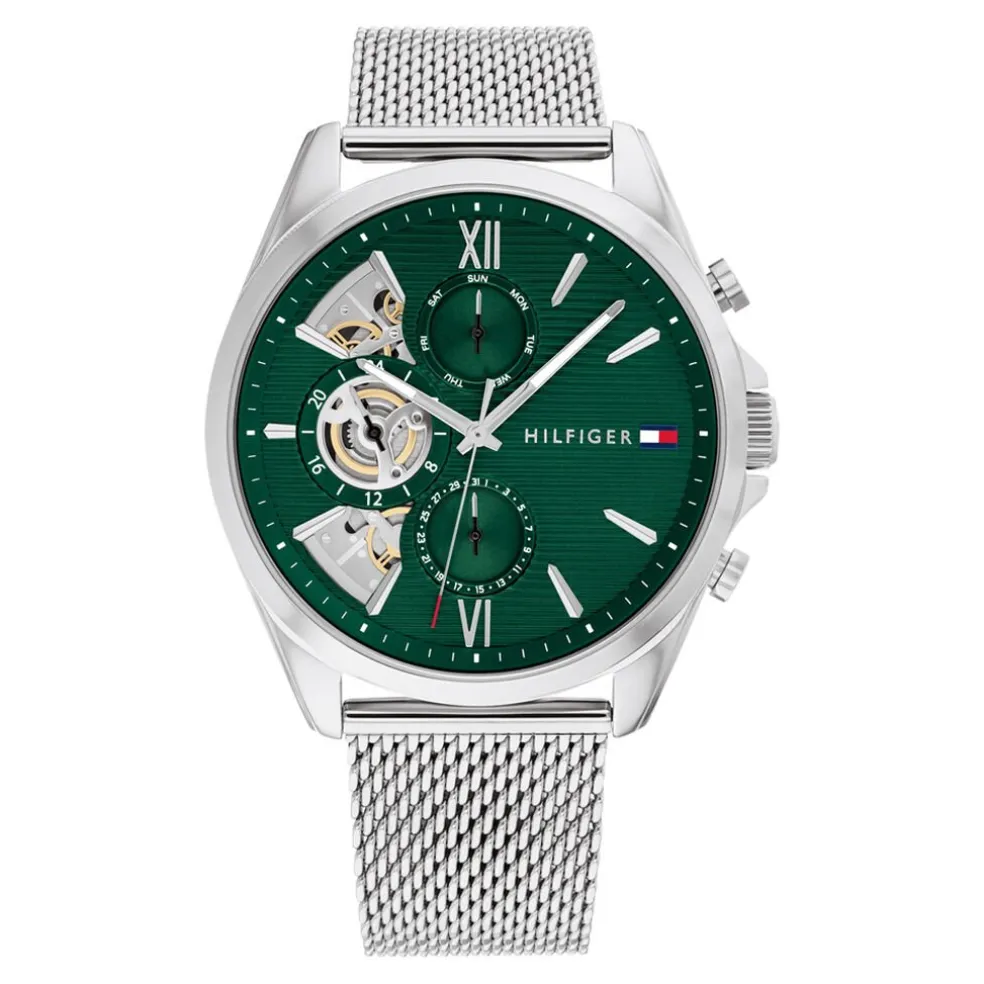 Montre Tommy Hilfiger Baker Acier Argente Ronde Quartz 44mm Fond Vert Bracelet Acier Inoxydable Argente Milanais 1710647