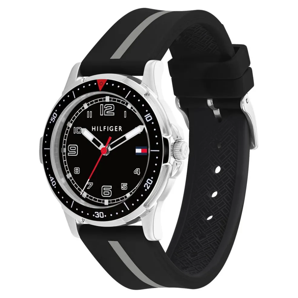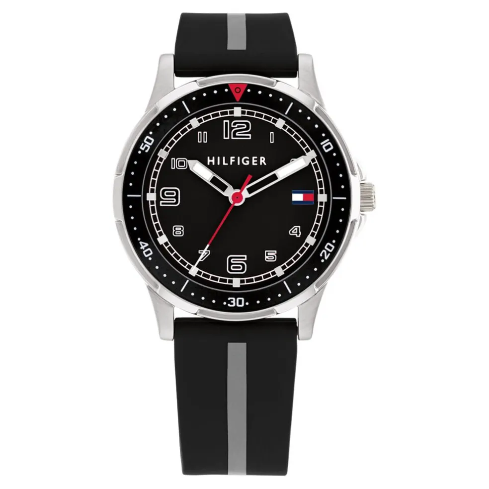 Montre Tommy Hilfiger Boys Acier Inoxydable Argenté Ronde Quartz 34mm Fond Noir Bracelet Silicone Noir Ligne Grise 1720034