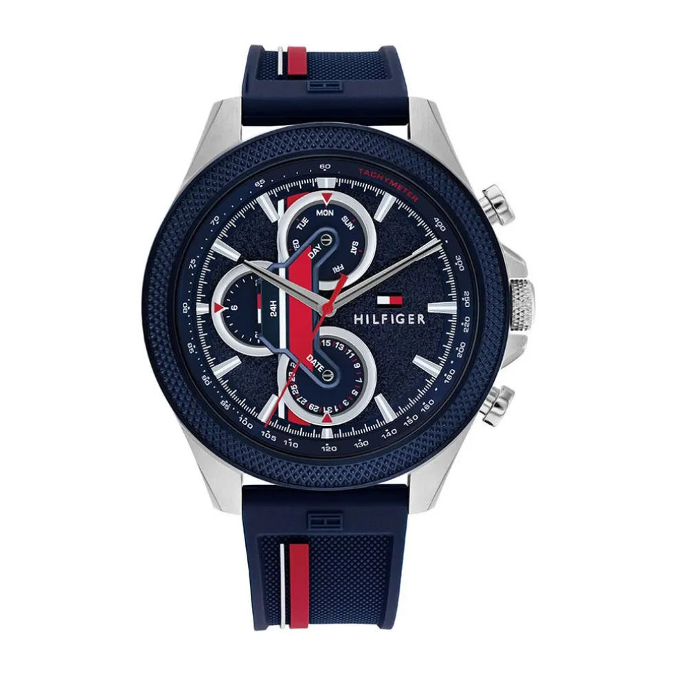 Montre Tommy Hilfiger Clark Acier Argente Rond Quartz Multifonction 46mm Fond Bleu Lunette Bleue Bracelet Silicone Bleu 1792083