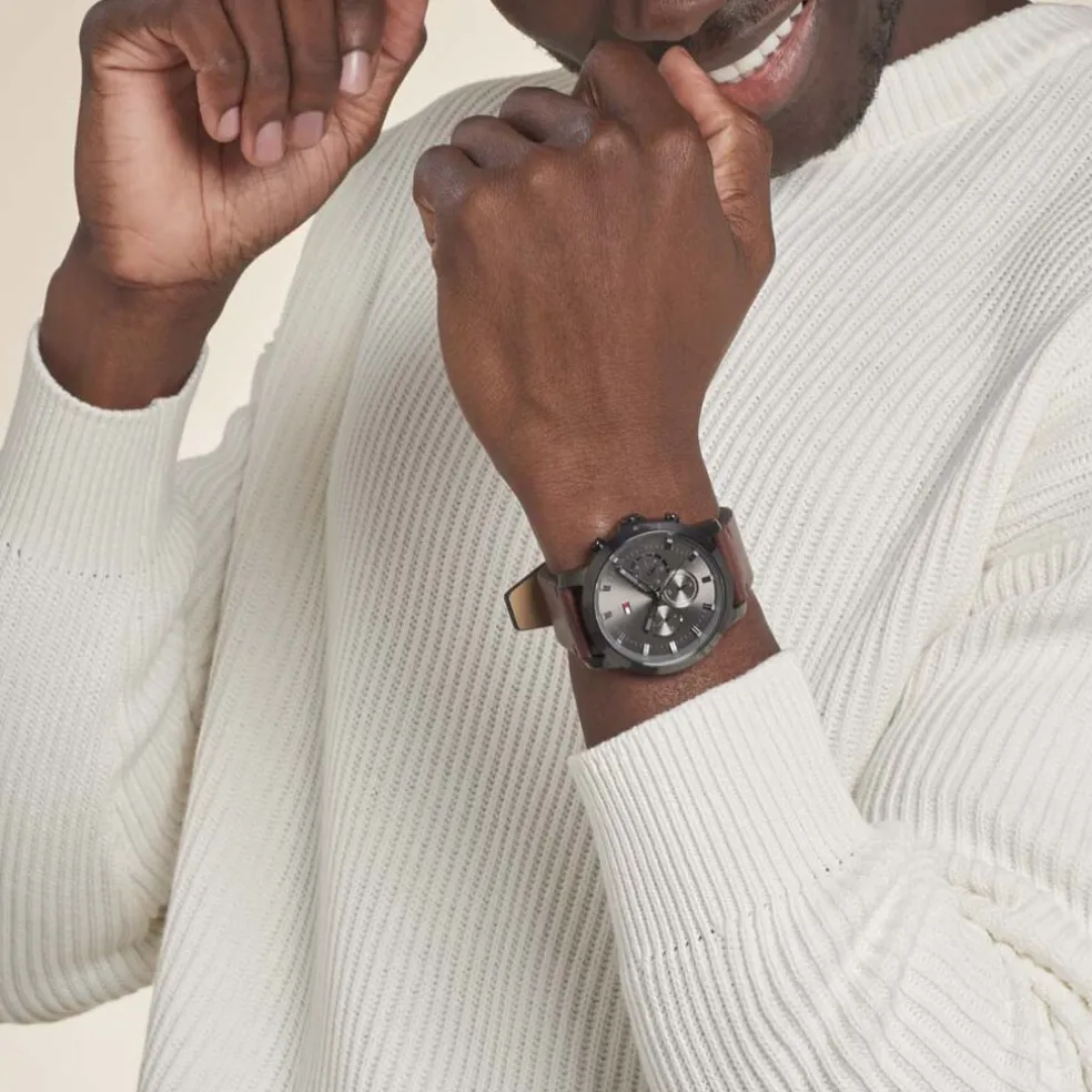 Montre Tommy Hilfiger Jameson Acier Noir Ronde Quartz Chronographe 44mm Fond Gris Bracelet Cuir Marron 1791799