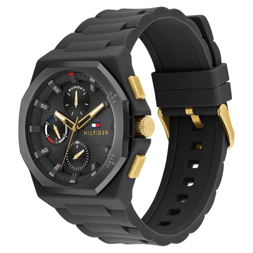 Montre Tommy Hilfiger Neo Acier Noir Geometrique Quartz Multifonctions 44mm Lunette Octogonale Fond Noir Bracelet Silicone Noir 1792120