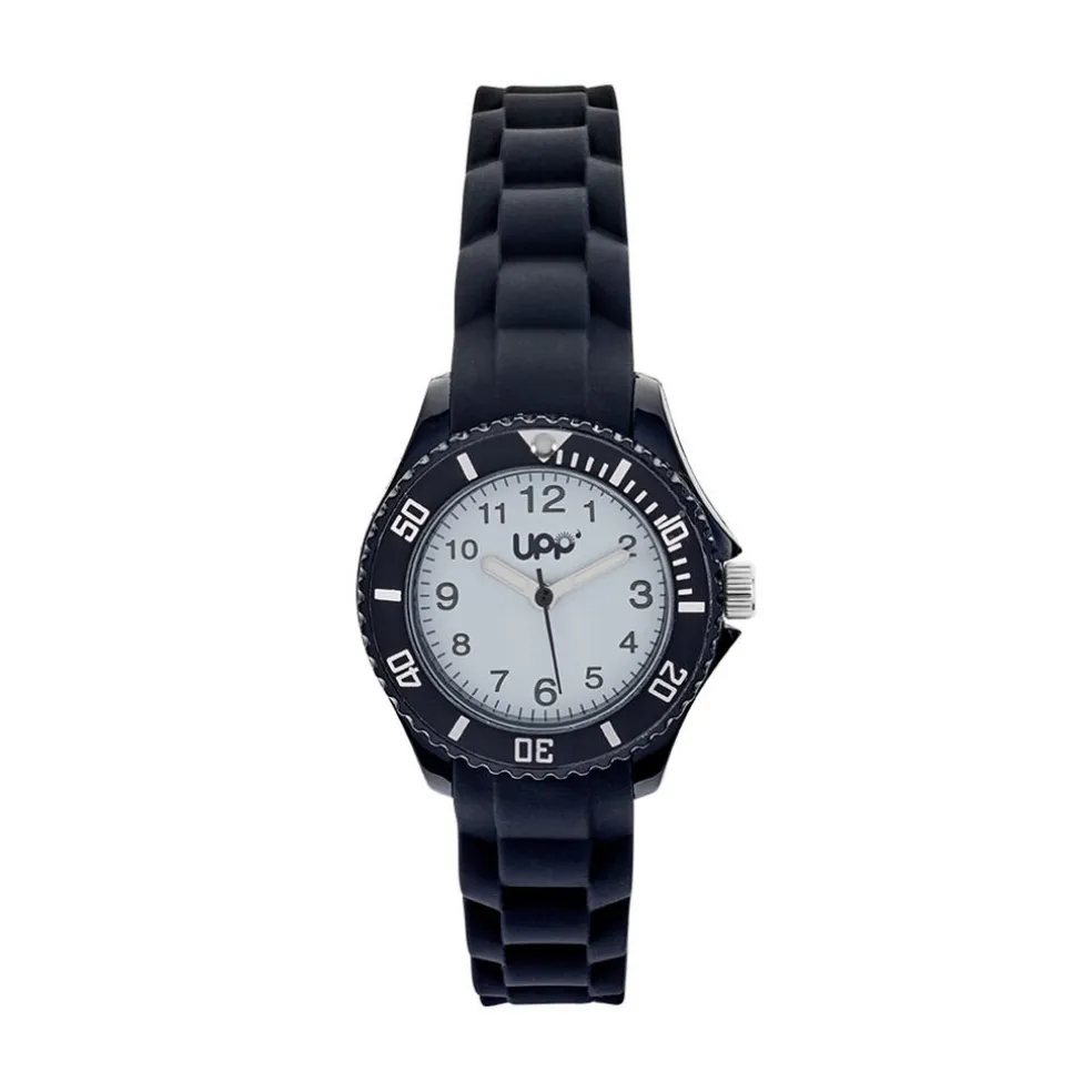 Montre Upp Aria Plastique Noir Ronde Quartz 29mm Lunette Tournante Noire Fond Blanc Bracelet Silicone Noir Cl246