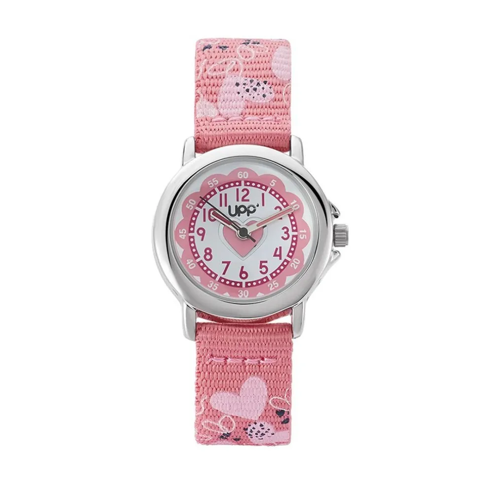 Montre Upp Lea Alliage Argenté Ronde Quartz 27mm Fond Blanc Et Rose Motif C艙ur Bracelet Tissu Rose Motifs C艙urs Cl254