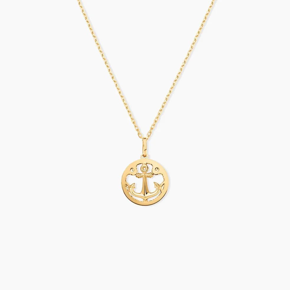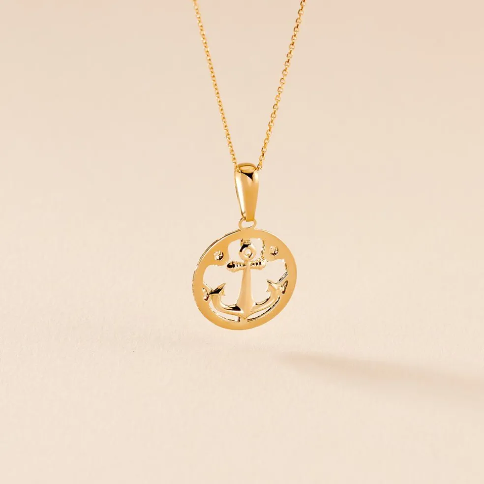 Pendentif Or Jaune 375/1000 Rond Motif Ancre Marine Ajoure 16mm