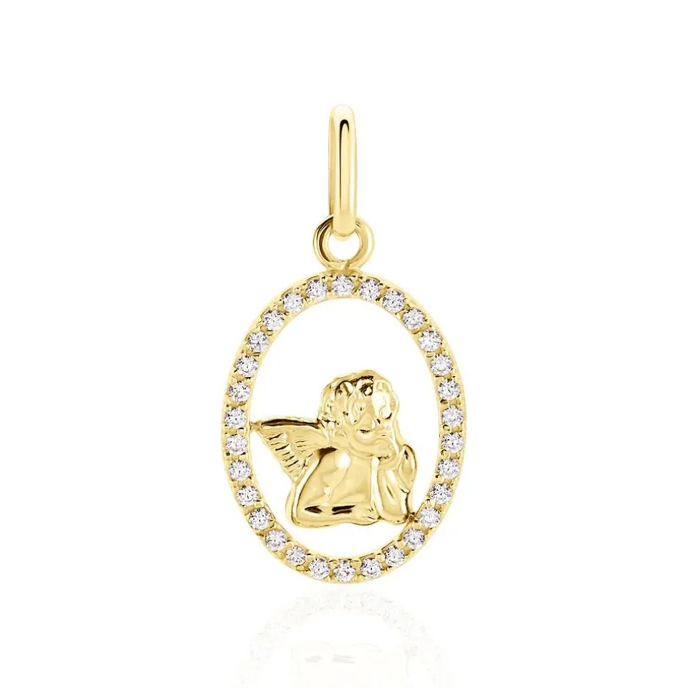 Pendentif Or Jaune 375/1000 Médaille Ovale Ajoure Pavage Oxyde De Zirconium Avec Ange 18mmx12mm