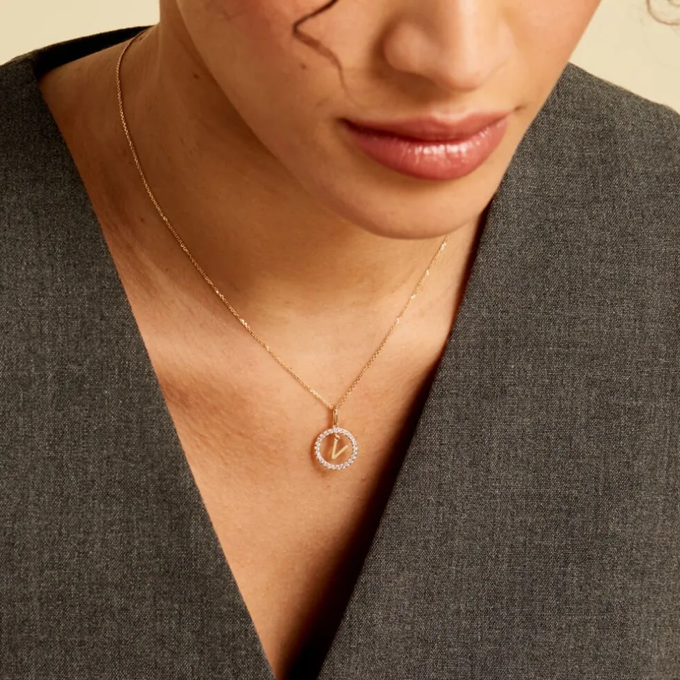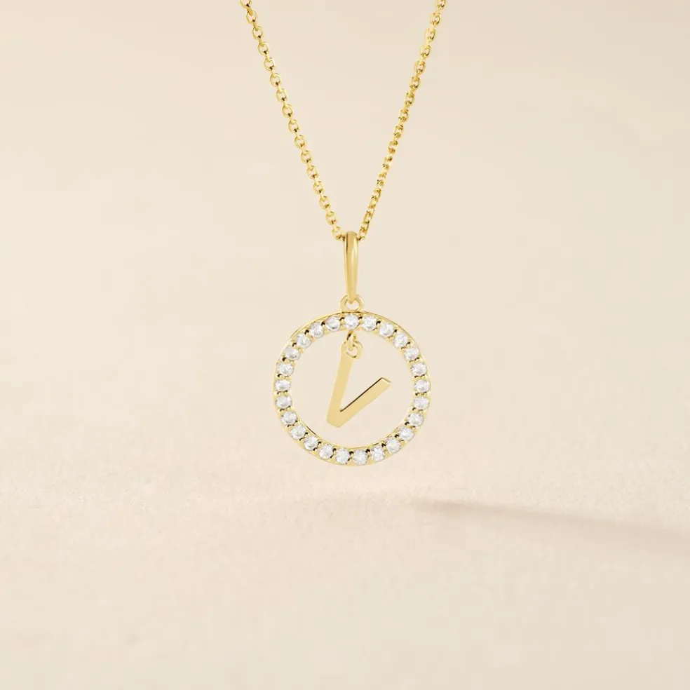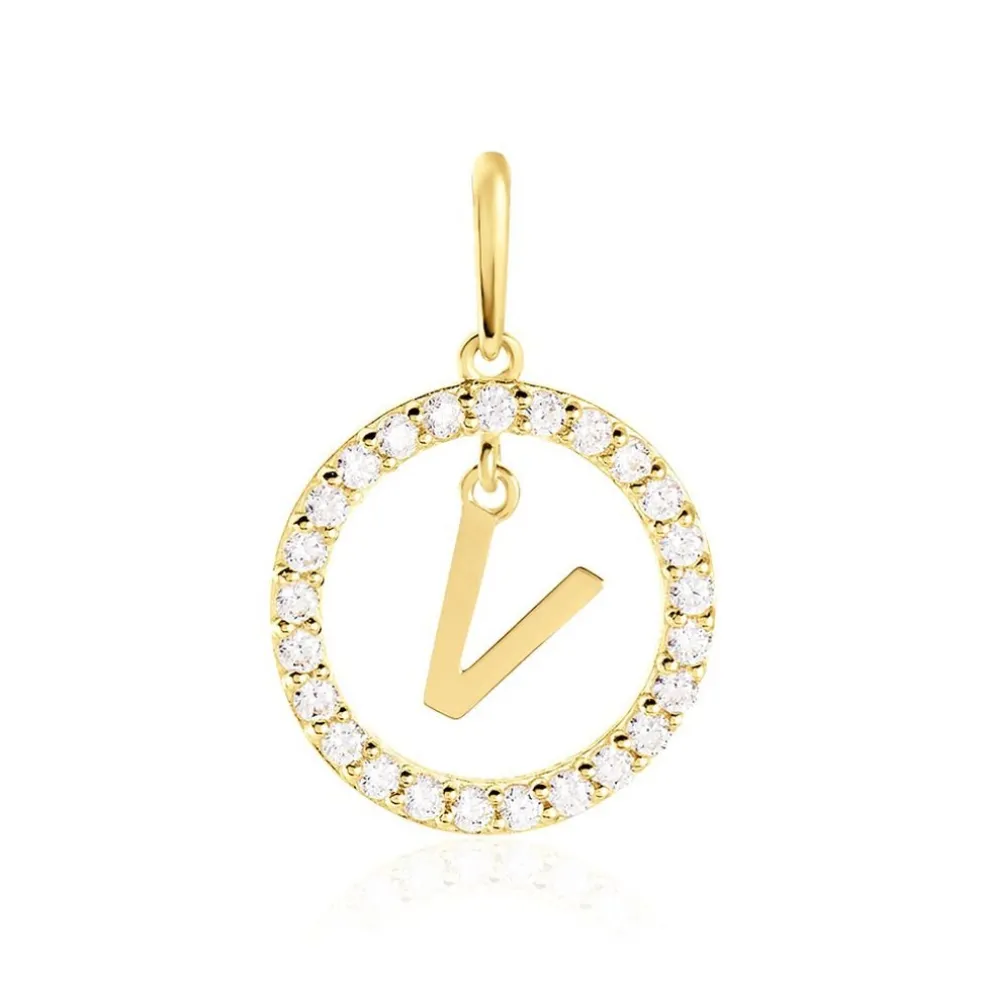 Pendentif Lettre V Or Jaune 375/1000 Entourage Oxyde De Zirconium Blanc