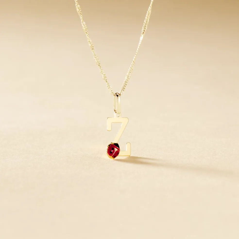 Pendentif Or Jaune 375/1000 Lettre Z Motif Coccinelle Email Noir Et Rouge