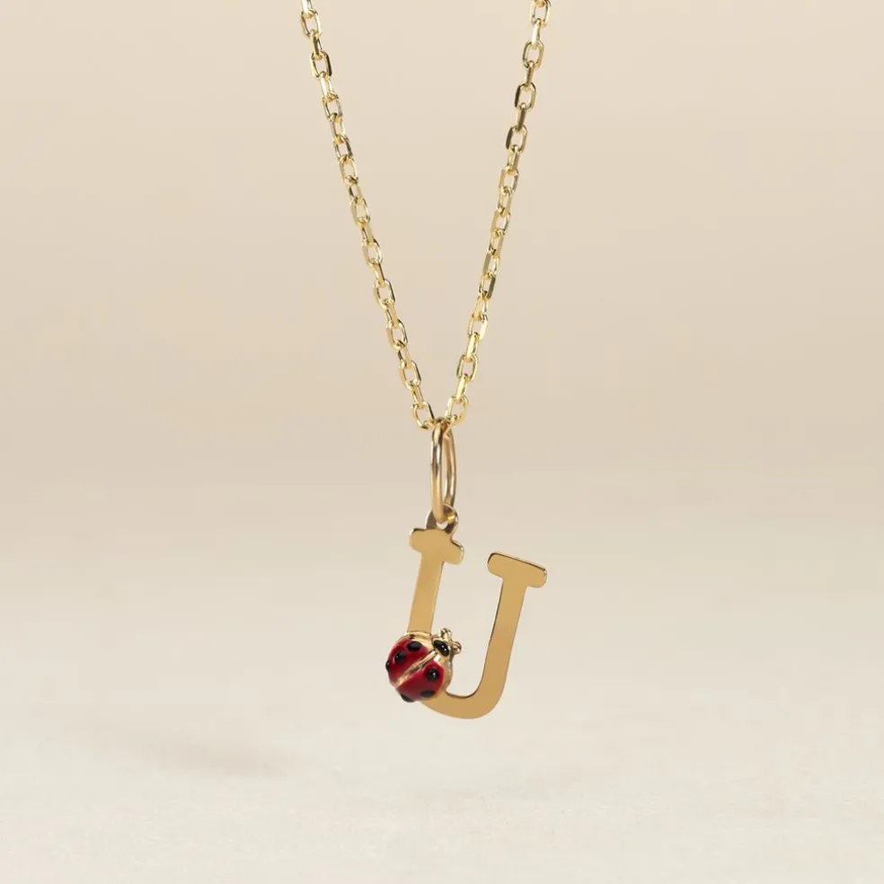 Pendentif Or Jaune 375/1000 Lettre U Motif Coccinelle Email Noir Et Rouge