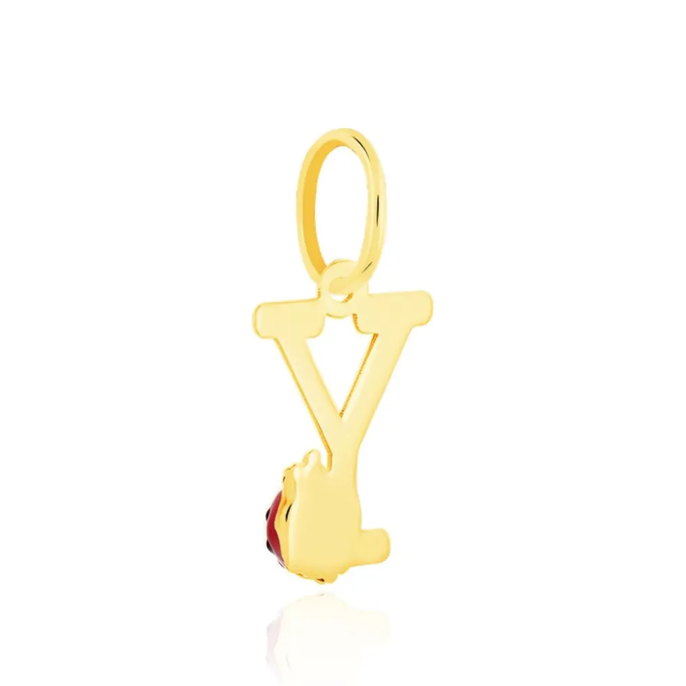 Pendentif Or Jaune 375/1000 Lettre Y Motif Coccinelle Email Noir Et Rouge