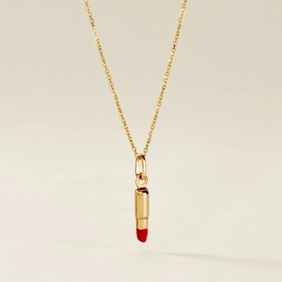 Pendentif Or Jaune 375/1000 Rouge A Levres Email Rouge