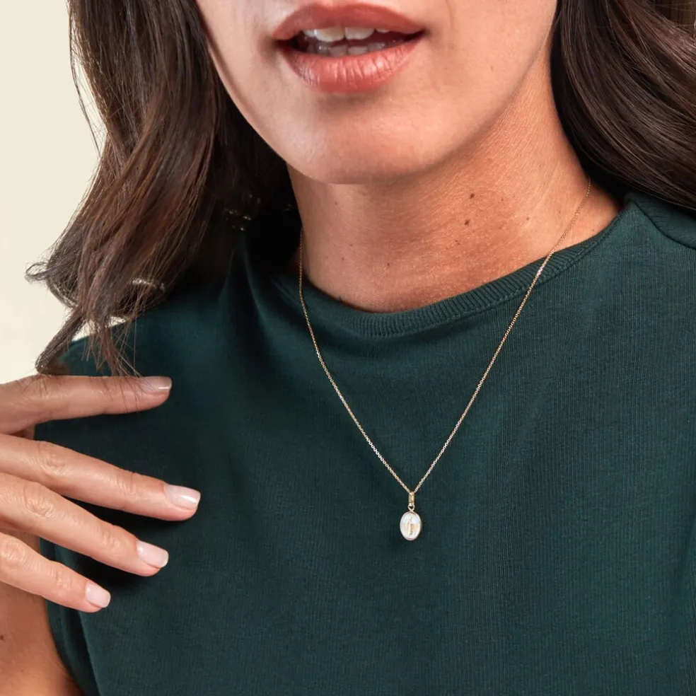 Pendentif Or Jaune 375/1000 Vierge Miraculeuse Ovale Email Bleu Sky 1.2cm