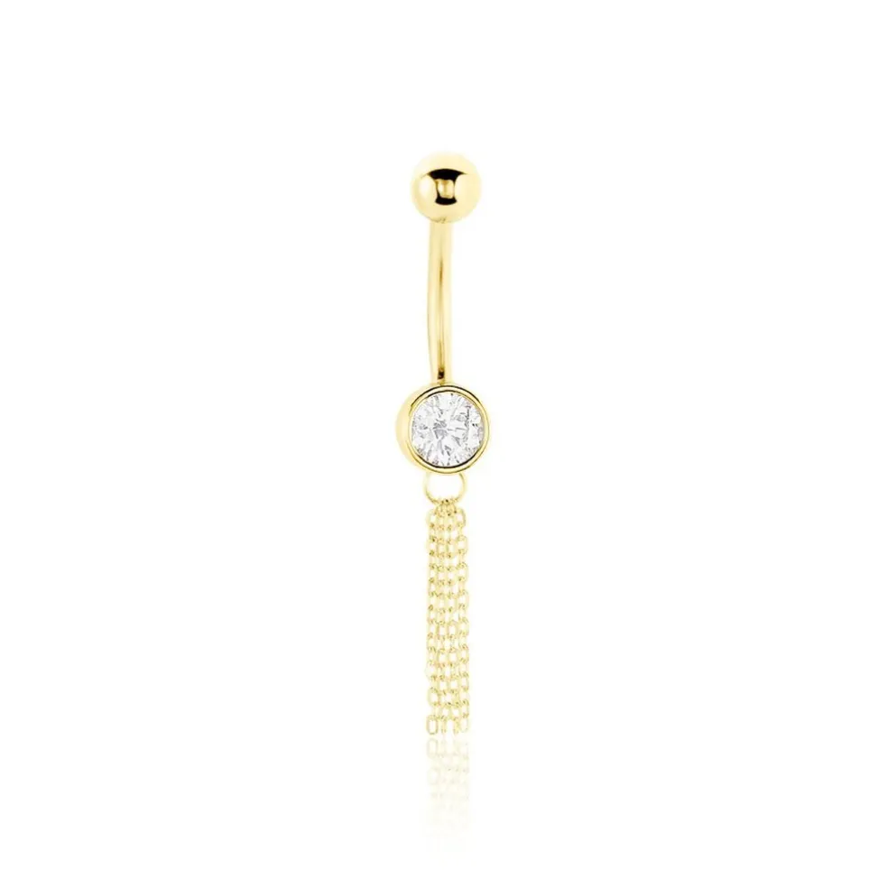 Piercing De Nombril Or Jaune 375/1000 Boule Oxyde De Zirconium Ronde Serti Clos Avec Chaines Forcat Longueur 2.33cm