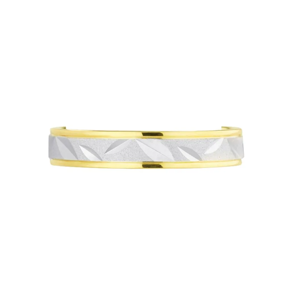 Alliance Or Bicolore 750/1000 Blanc Et Jaune Fantaisie Ruban Satine Motif Feuilles Ciselees 4mm