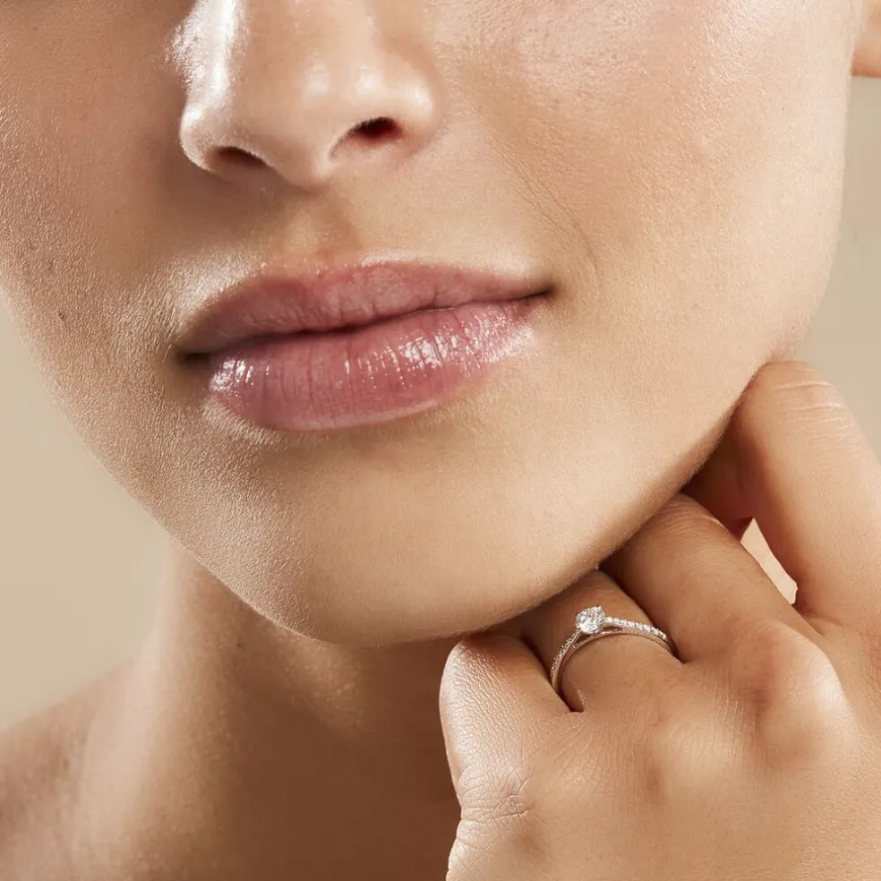 Solitaire Or Blanc 750/1000 Diamant Central Synthetique 0.30cts Serti Griffes Accompagne Diamants Synthetique