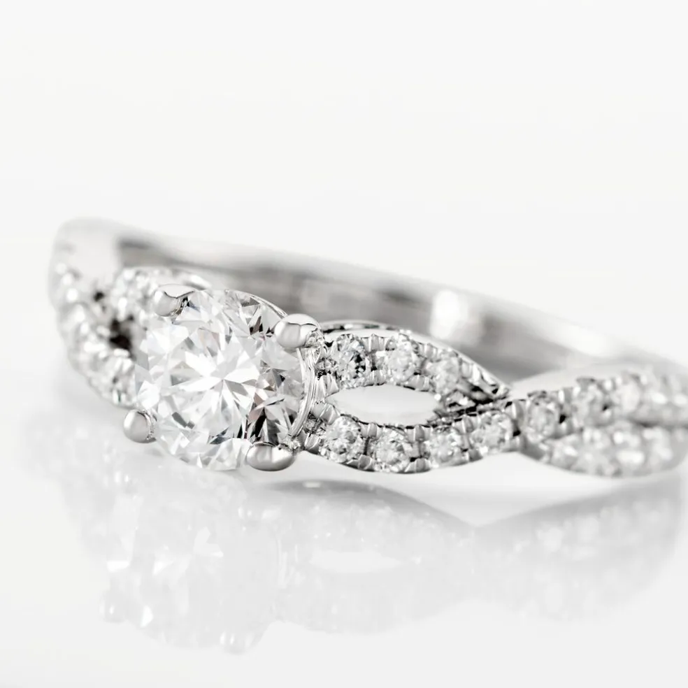 Bague Solitaire Or Blanc 750/1000 Diamant Synthétique Central 0.51cts Corps De Bague Entrelace Accompagné Diamants Synthétiques