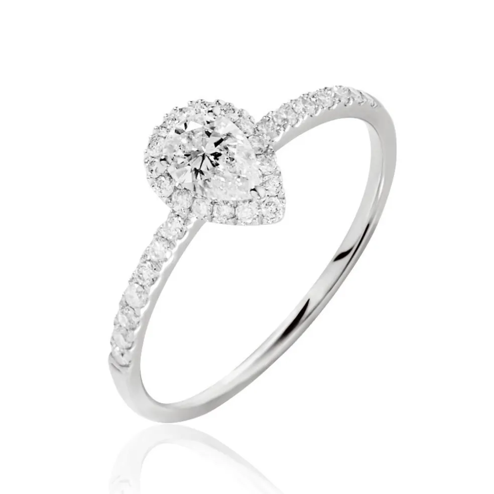 Solitaire Or Blanc 750/1000 Diamant Central Forme Poire 0.32cts Accompagne Diamants