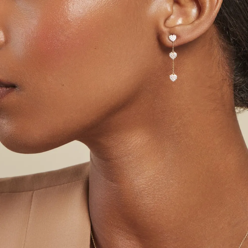 Boucles D’oreilles Pendantes Or Jaune 375/1000 Trilogie C艙ur Pavage Oxyde De Zirconium