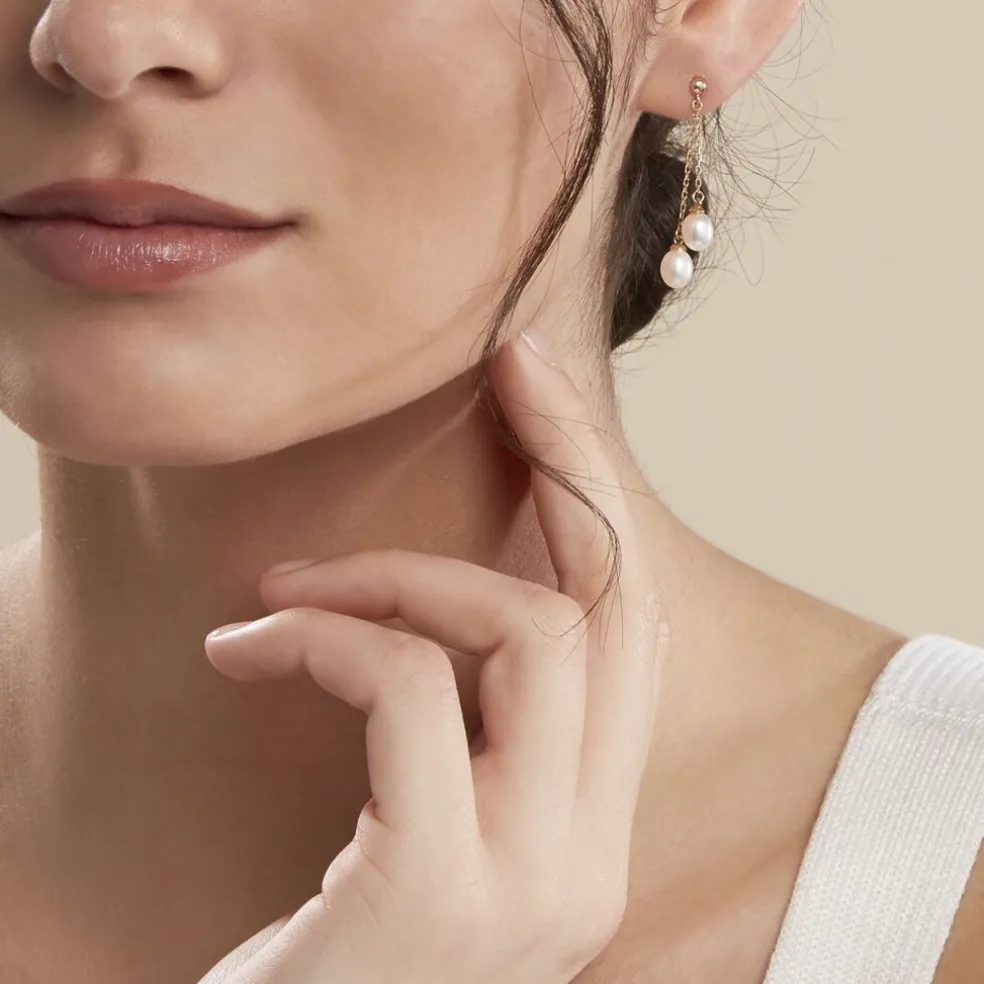 Boucles D’oreilles Pendantes Or Jaune 375/1000 Perles De Culture 7/5.4mm