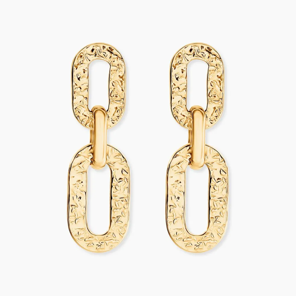 Boucles D’Oreilles Pendantes Or Jaune 375/1000 Maillons Rectangles Effet Martele