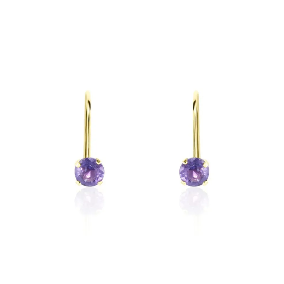 Boucles D’oreilles Pendantes Dormeuses Or Jaune 375/1000 Améthyste Violet Serti 4 Griffes
